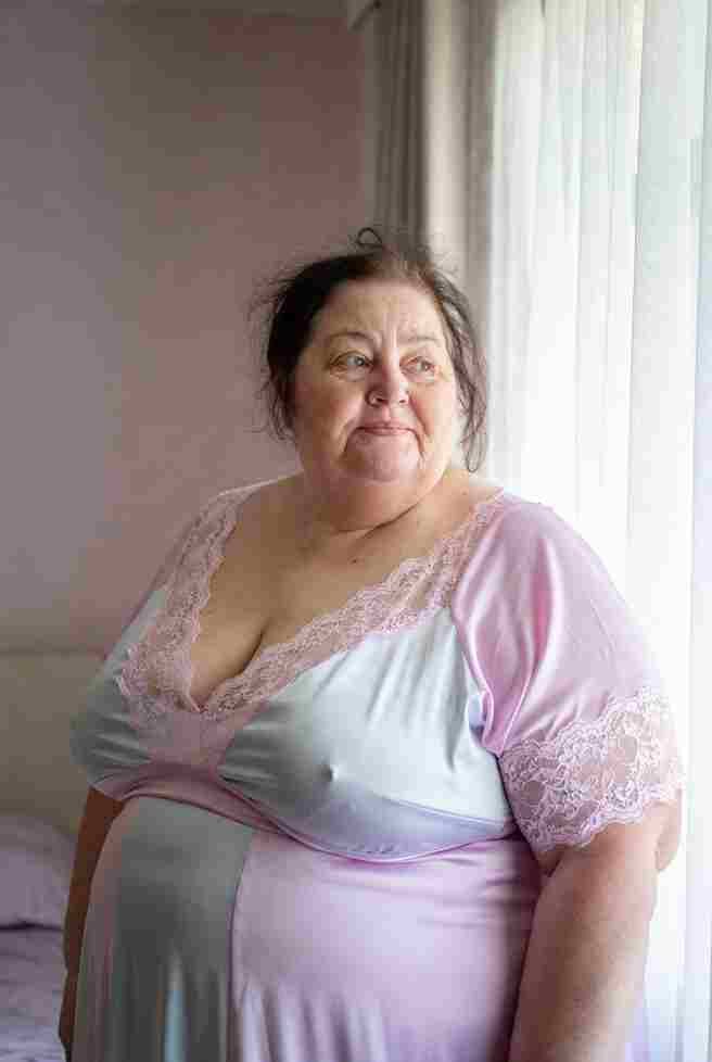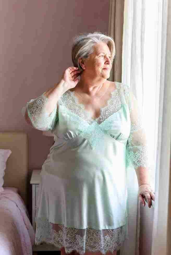 Draped over the arm of a velvet armchair in a scandalously short white satin slip that rides up to expose everything below the waist—no panties underneath. The fabric clings to her sweat-slicked skin, translucent where it’s wet. Legs dangling, one high heel swinging lazily, she reaches down between her spread thighs and drives two fingers deep while her palm slaps wetly against her swollen clit in rhythmic smacks. She arches her neck, letting her head fall back over the armrest, hair spilling like silk, and moans in a low, husky voice that drips sex. Her hips buck upward teasingly, offering herself to the empty room. Tension coils tight—her stomach clenches visibly—then she cries out sharply. A massive squirt rockets upward, raining back down over her satin-covered breasts and pooling in the dip of her navel before cascading off the sides.